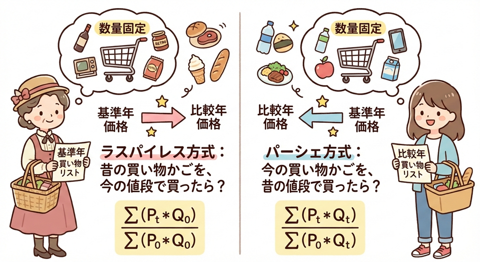 - ラスパイレス:昔の量 × 今の価格 → 高めに出る